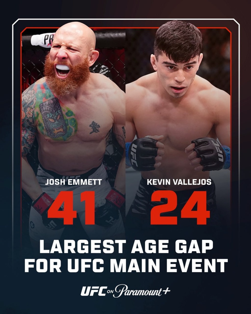 Разница в возрасте между участниками главного боя предстоящего турнира UFC, Джошем Эмметтом и Кевином Вальехосом, составляет 17 лет. Это самая большая разница в возрасте между участниками главного боя в UFC. Один делает ставку на опыт, другой — на молодость и свежесть. ❓Чей фактор окажется решающим в этом бою? 🔥 — Опыт Эмметта ❤️ — Молодость Вальехоса 👊 Подпишись на Meta MMA | Meta MMA в MAX | Наш канал в ВК