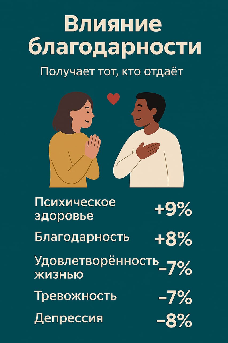 Телеграм канал HR-аналитики | НАШ КАНАЛ В VK Ученые из Бразилии — из Университета Сан-Паулу, Faculdade de Ciências Médicas de Santos и проекта Plenae — проанализировали 64 научных исследования с участием 5000+ человек. Они выяснили: если человек начинает регулярно благодарить других (через дневники, письма, размышления), то у него происходят заметные улучшения по ключевым психологическим показателям. 📌 Получает тот, кто отдаёт — именно благодарящий человек становится психически устойчивее и счастливее. 🔹😟 Тревожность снижается на 7,8% → GAD-7: −1,63 балла — переход от умеренной тревожности к лёгкой 🔹😞 Депрессия уменьшается на 6,9% → PHQ-9: −1,86 балла — клинически значимое улучшение 🔹🧠 Психическое здоровье улучшается на 5,8% → MHC-SF: +0,29 балла — рост эмоционального и социального благополучия 🔹😊 Удовлетворённость жизнью растёт на 6,9% → SWLS: +0,48 балла — устойчивый сдвиг в сторону счастья 🔹💖 Чувство благодарности усиливается на 3–6% → GQ-6: +1,54 балла и +0,24 балла
