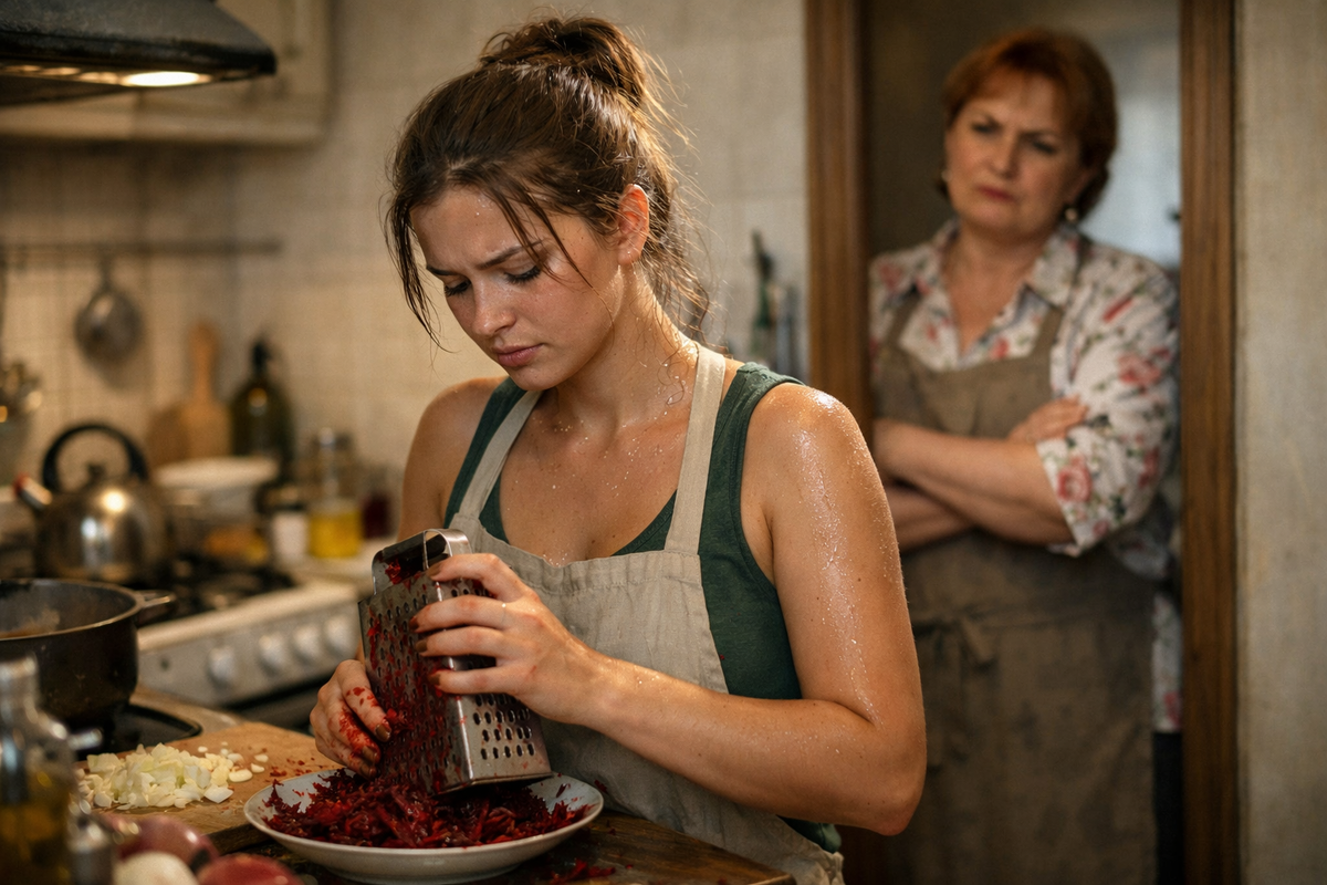 Я стояла у плиты и чувствовала, как по спине стекает пот. Не от жары. От того, что за моей спиной, облокотившись на косяк, стояла ОНА. Свекровь. И комментировала каждое моё движение голосом, от которого хотелось выть. - Лук крупнее режь! Мой Сашенька не любит мелкий. И свёклу не так натираешь - видишь, какая каша получается? Я сжала зубы и продолжала тереть. Пять лет брака. Пять лет этого кошмара каждые выходные. Началось всё в первый же месяц после свадьбы. Мы с Сашей сняли квартиру, но его мама решила, что "молодым нужна помощь". Приезжала каждую субботу. Вываливала на стол пакеты с продуктами и начинала своё шоу. - Дорогая, я тебя научу готовить так, как любит мой сын! Сначала я радовалась. Наивная. Думала, свекровь хочет помочь. Что мы подружимся, будем пить чай и болтать по душам. Как же я ошибалась. Тамара Викторовна - так её звали - превратила мою кухню в филиал ада. Она не учила. Она терроризировала. Каждое блюдо разбиралось на молекулы. Каждая специя обсуждалась час. А если я