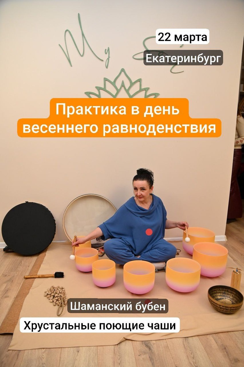 ! 👋🏻 Приглашаем на Звуковую практику в день Весеннего равноденствия. 🧘🏼♀️ 22 марта (воскресенье) с 13:00 - 15:00 . В день весеннего равноденствия можно особым образом загадать желание. Очищаем свое энергопространство и наши тонкие тела с помощью шаманского бубна. Расслабляемся под звуки поющих чаш и в красках представляем задуманное, настраиваемся на позитив. Со мной в паре проводит практику шаманка с Байкала Надежда. Будет индивидуальная работа с каждой участницей с шаманским бубном. Далее групповая практика с поющими чашами и другими интуитивными инструментами Полная звуковая балансировка организма. Уровень звука от 1 до 10. Вибрации Земли, Воды, Огня и Воздуха. Четыре первоэлемента в одном погружении будут звучать, глубоко очищая и наполняя тебя своей силой. Мир соткан из первоэлементов, мы состоим из них. Наши системы организма реагируют на тонкие вибрации инструментов, звук настраивает нас на естественное природное состояние - состояние покоя, гармонии и целостности. Хру
