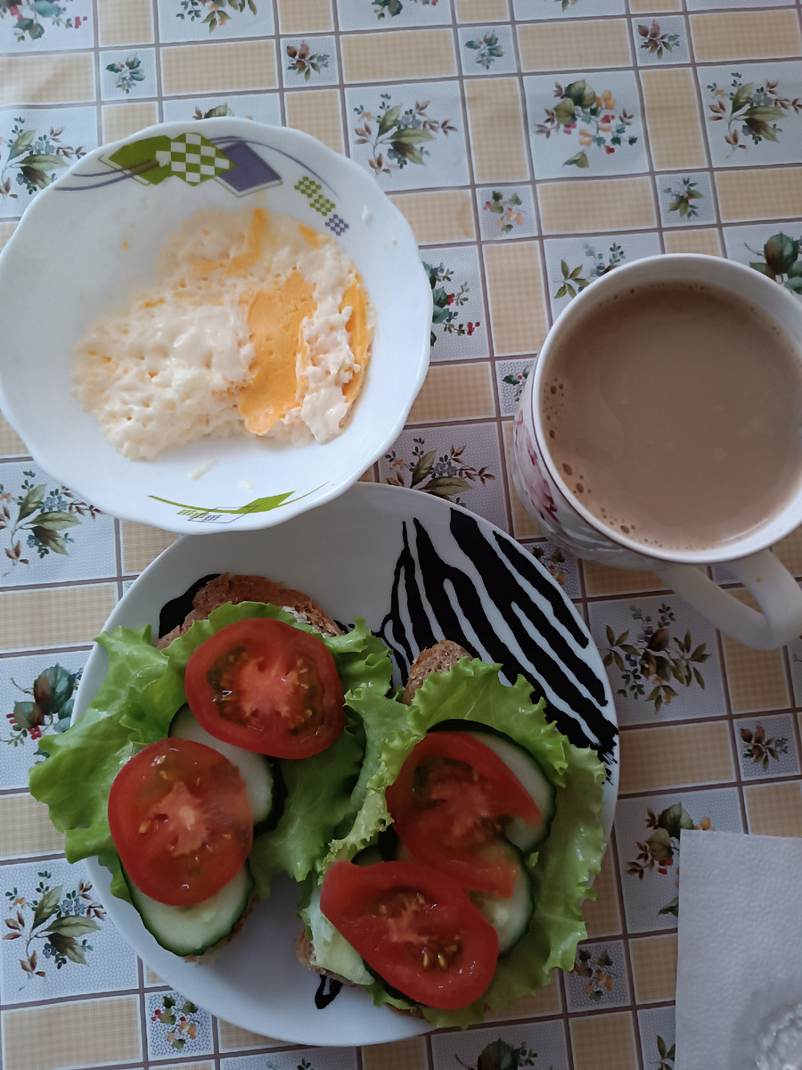 - Завтрак - омлет (немного передержала в микроволновке ), кофе и бутерброды: