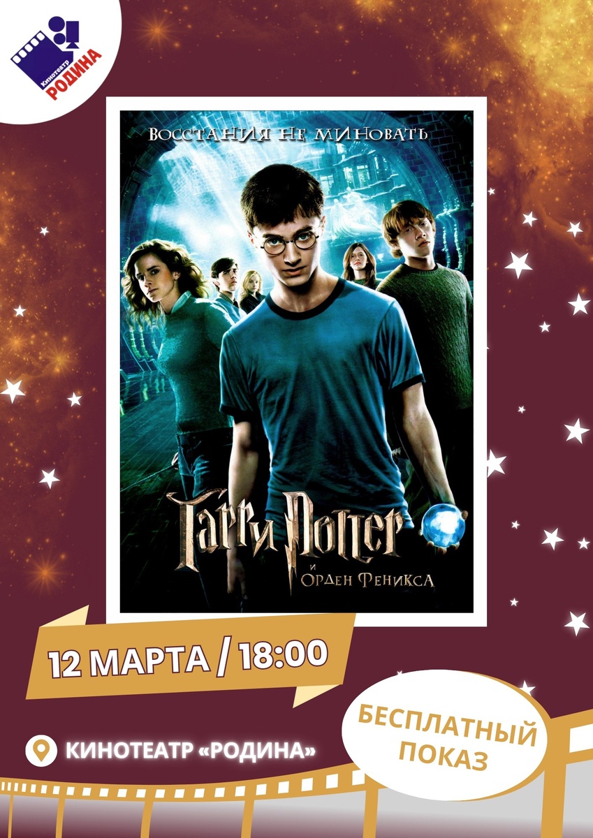 марта! Не упустите возможность окунуться в мир кино! Приобрести их онлайн или по Пушкинской карте можно прямо сейчас, перейдя по ссылке clck.ru/sctFt А теперь самое главное для всех поклонников мира магии! По уже сложившейся традиции, мы приглашаем вас на бесплатный показ культового фильма "Гарри Поттер и Орден Феникса"! Погрузитесь в атмосферу Хогвартса, переживите вместе с Гарри и его друзьями все испытания и почувствуйте силу дружбы и отваги. До встречи в кинотеатре "Родина"!