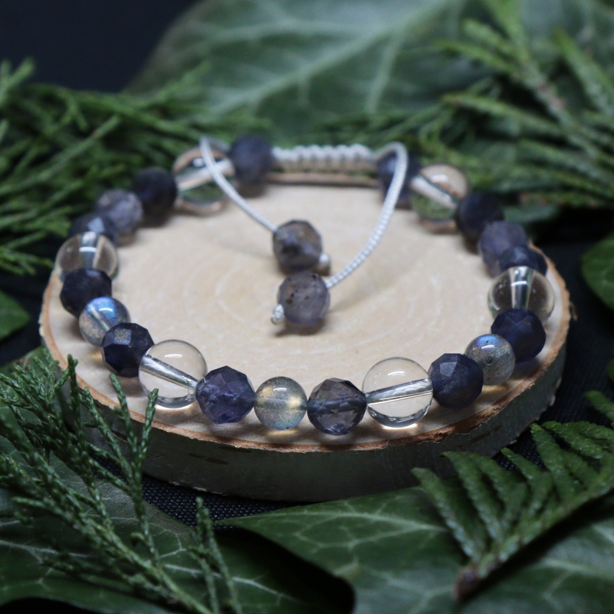 Браслет "Фиалковый дождь" из иолита, горного хрусталя и лабрадора