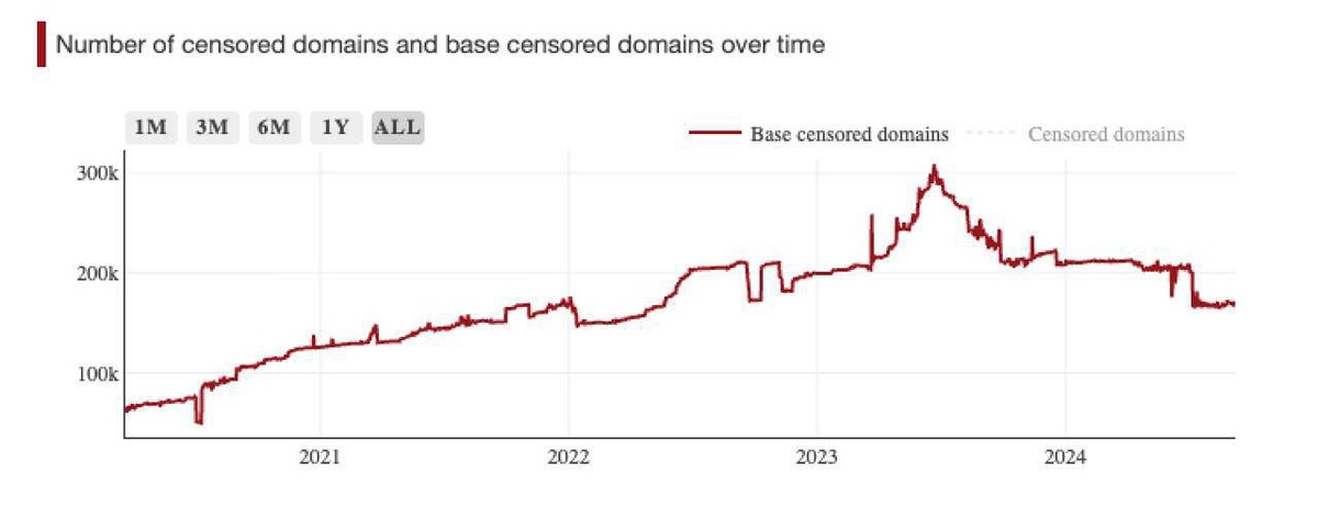 В 2023 году в Китае число заблокированных ресурсов достигло 310 тыс., но затем снизилось до 171 тыс. В России же количество блокировок продолжает расти и уже превышает 300 тыс. доменов Подписывайся на Telegram @svoixnebrosaem