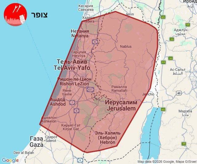 Пуск ракет из Ирана - по центру, от Ашкелона до Хадеры, и Иерусалиму, Иудее и Самарии.