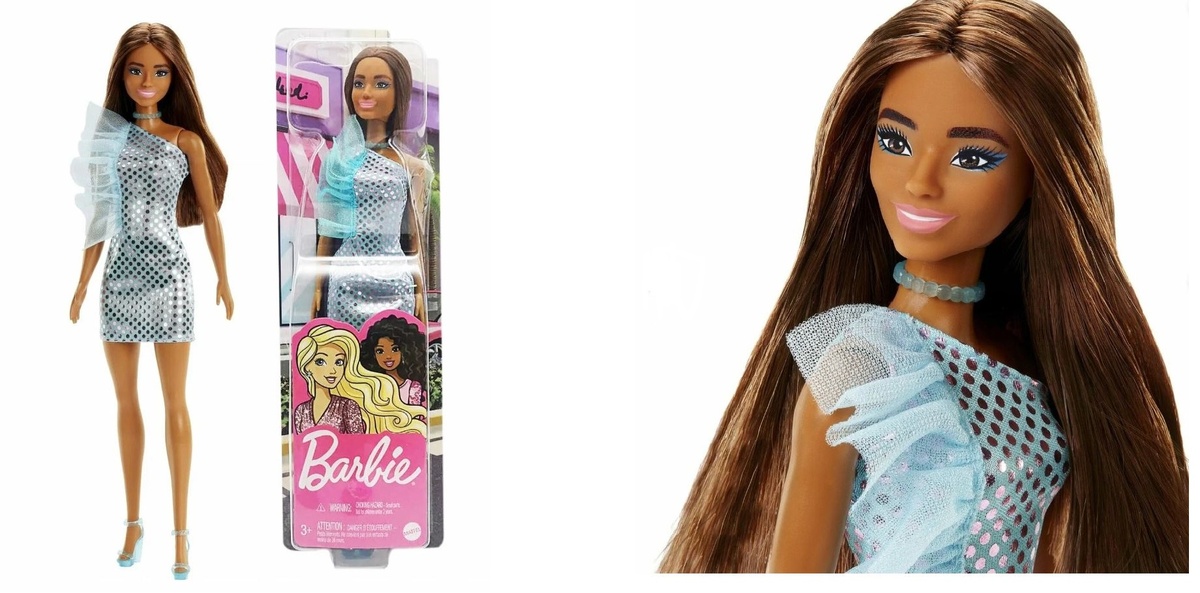 Кукла Барби, «Игра с модой», голубое платье, HR95 — это у нас куколка-мулатка. Она достаточно тёмненькая. У неё яркий голубой макияж глаз, розовые губы. Волосы у неё, на мой взгляд, тёмно-русые, прошивка хорошая из двух цветов волос. Стопа у неё каблучная, тело хорошее, качественное: ручки разводятся в стороны и двигаются вперёд-назад, ножки — вперёд-назад и немного в стороны. На теле — Made in Indonesia, 2015 год. Голова, молд не подскажу (буду благодарна за название молда – пишите в комментарии). На голове у неё 2020 год Mattel. Головушка мягкая, хорошая, волосы приятные, не лезут. Прошита она в два цвета. Это не сразу заметно, потому что оттенки волос отличаются совсем капельку, и глазу это поймать тяжело, но да, там есть два оттенка прядок. Ручки прямые, ножки прямые, фигура стандартная. Аутфит — голубое платье с яркими розовыми блестящими горошками, небольшие рюши сбоку, платье через одно плечо. Босоножки голубые, прозрачные, очень классные, но мне, к сожалению, не повезло. Они