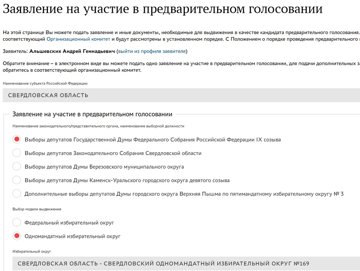 С 11 марта по 30 апреля – период для регистрации кандидатов. Я отправил заявку по Свердловскому одномандатному округу № 169, в который входят Ленинский, Верх-Исетский, Железнодорожный, Академический районы Екатеринбурга. Эту территорию представляю в парламенте два созыва подряд. Непосредственно голосование состоится с 25 по 31 мая. Только избиратели решат, кто представит партию на выборах в Госдуму.