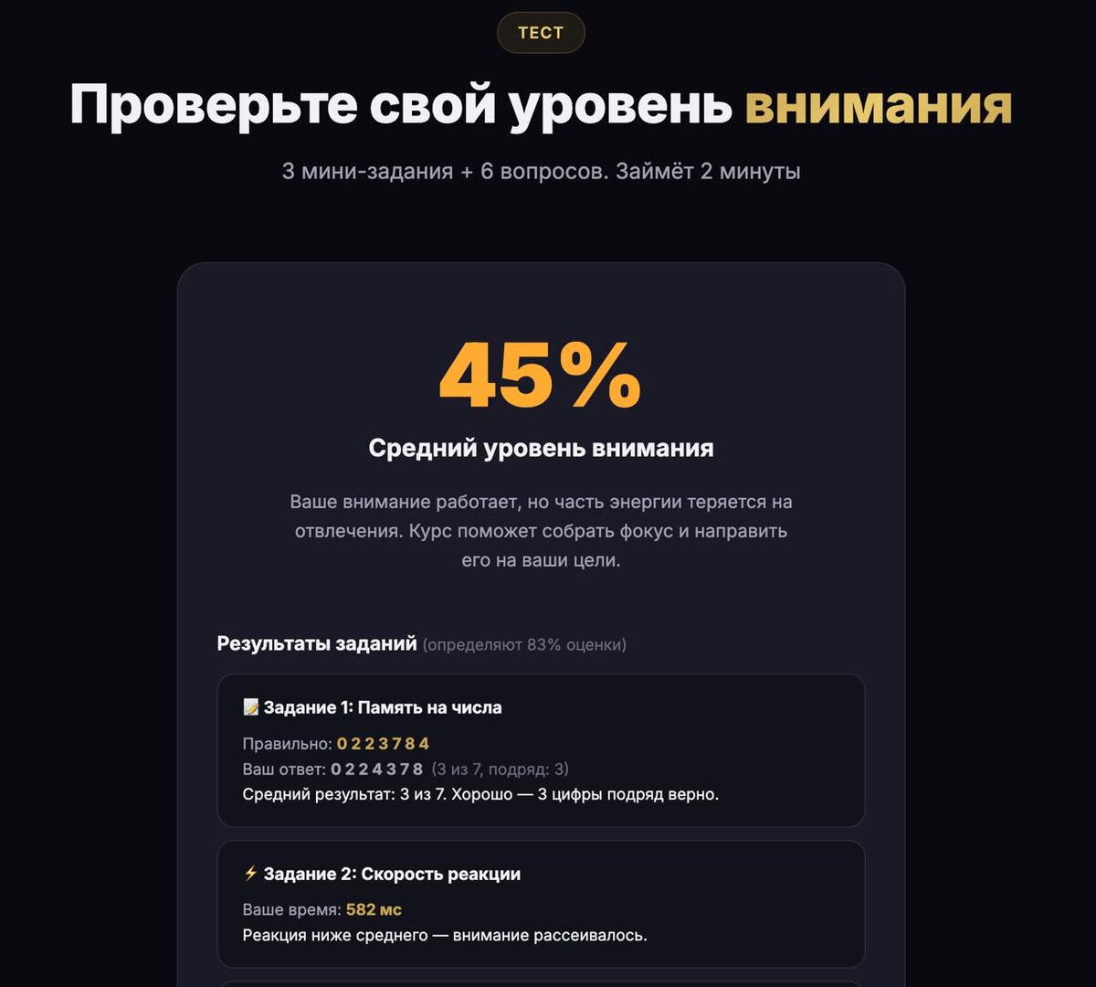 🎯 Хотите проверить уровень своей внимательности? На сайте мы разместили небольшой тест. Перейдите по ссылке и нажмите кнопку «Измерьте свою концентрацию за две минуты». Пройдите его и присылайте в комментарии скриншоты ваших результатов. Обратите внимание на людей, которые добиваются результатов. Неважно, в какой сфере: бизнес, творчество, отношения, здоровье. Их объединяет одна способность — они умеют удерживать внимание на том, что действительно важно. Не распыляться по мелочам, не дёргаться на каждый сигнал, не кормить внутренний шум. Собранный человек иначе принимает решения — быстрее и точнее. Он иначе общается — слышит собеседника, а не прокручивает свои мысли. Восстанавливается иначе — не тащит рабочие проблемы в постель и не просыпается уже уставшим. И чувствует себя иначе — с большим запасом энергии и меньшим грузом тревоги. Это и есть другой уровень жизни. Он не требует сверхусилий. Не нужно становиться кем-то другим. Достаточно одного — научиться управлять своим вниманием.