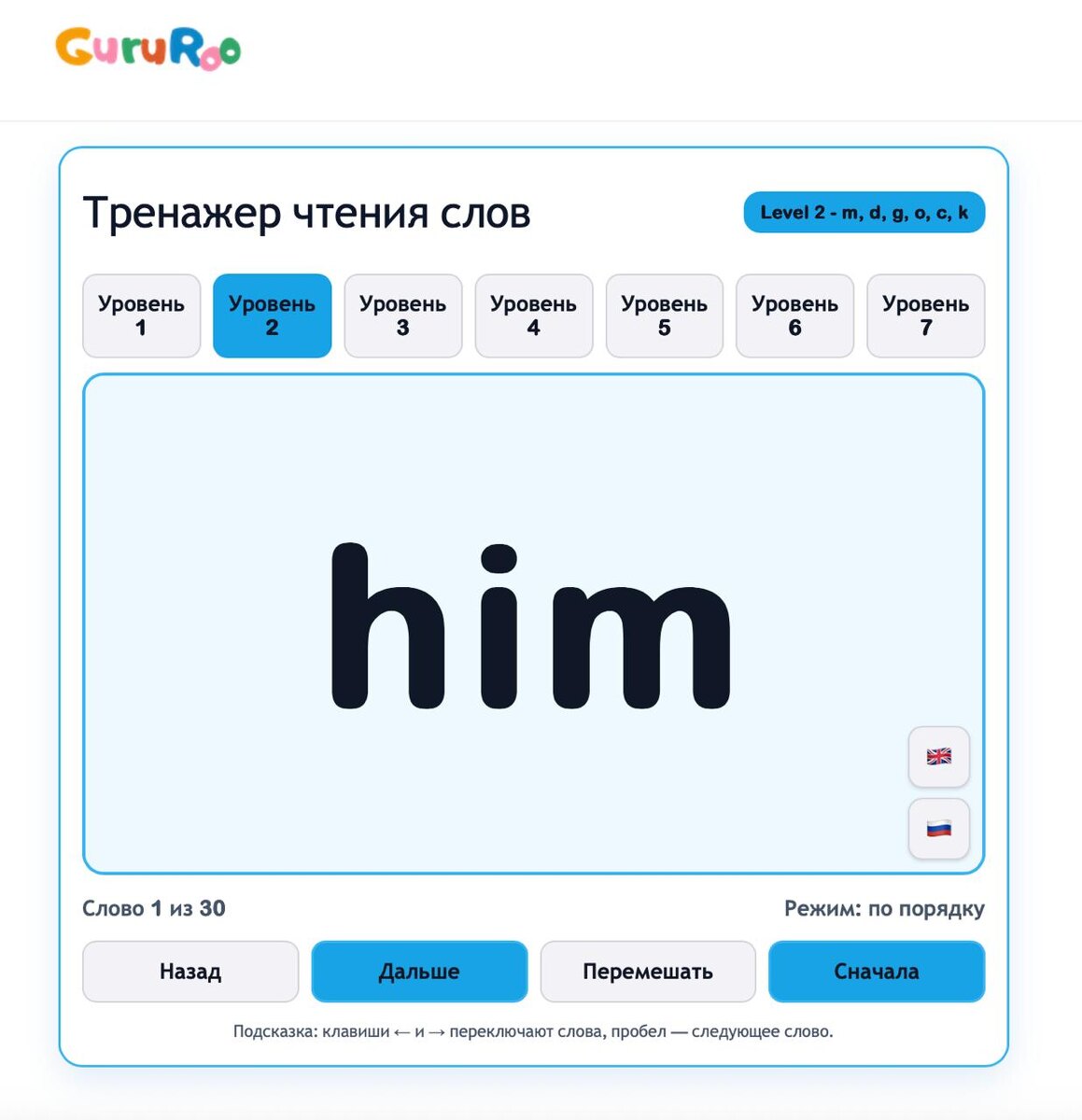 Один из них по чтению. Попробуйте с детьми, работает без авторизации. Слова для чтения сгруппированы по уровням, каждое слово можно перевести на русский (что удобно для билингвов и изучающих английский как иностранный). https://gururoo.16min.ru/training/view/trenaghery/lesson/chitaem-i-uchim-slova-po-urovnyam-sloghnosti Так же посмотрите и другие тренажеры, они могут быть полезны Скидка 45% на СЛЕДУЮЩИЙ учебный год в международной школе ГуруРу (обучение на английском языке). Запись открыта с 1 по 4 класс. Скидка дейстуует сегодня последний день. Как выбрать, в какой класс записать ребенка, смотрите в галерее «Готов ли ребенок». Начало обучения в сентябре 2026 года (или в феврале 2027 года, на ваш выбор). Запись по ссылке: https://gururoo.ru Надо открыть тренажер в браузере! Не в телеграм!
