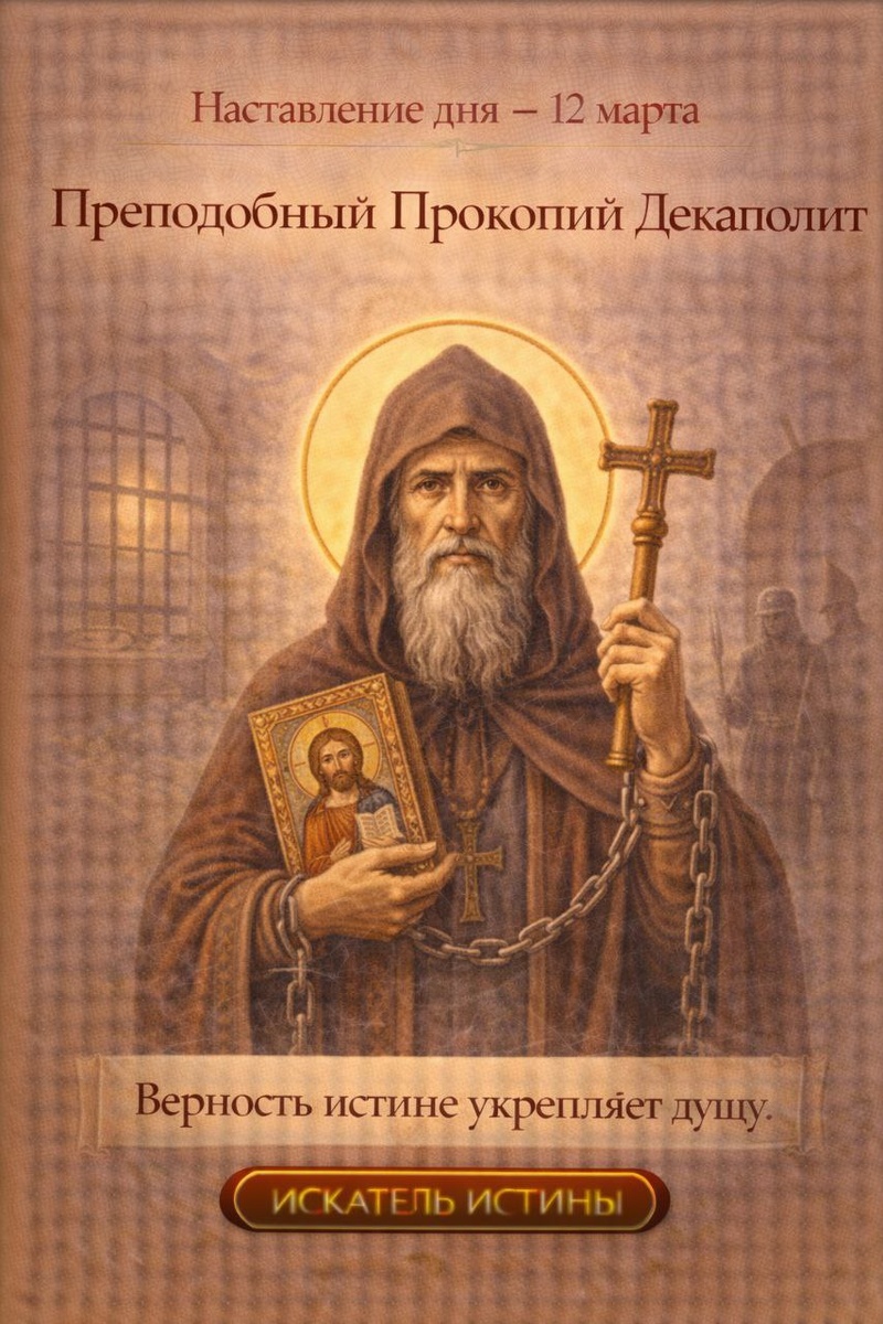 Преподобный Прокопий Декаполит В этот день Церковь вспоминает преподобного Прокопия Декаполита — подвижника, который посвятил свою жизнь молитве, посту и защите православной веры. Святой Прокопий жил во времена иконоборческих споров, когда почитание святых икон подвергалось гонениям. Он твёрдо исповедовал православное учение и не соглашался отказаться от почитания икон. За свою верность Церкви преподобный претерпел заключение и страдания. Однако испытания не поколебали его веры. Он оставался стойким и продолжал хранить истину. Жизнь святого показывает, что духовная сила человека проявляется в верности Богу даже тогда, когда это связано с трудностями и лишениями. Память преподобного Прокопия напоминает нам: любовь к истине требует мужества, терпения и твёрдости духа.