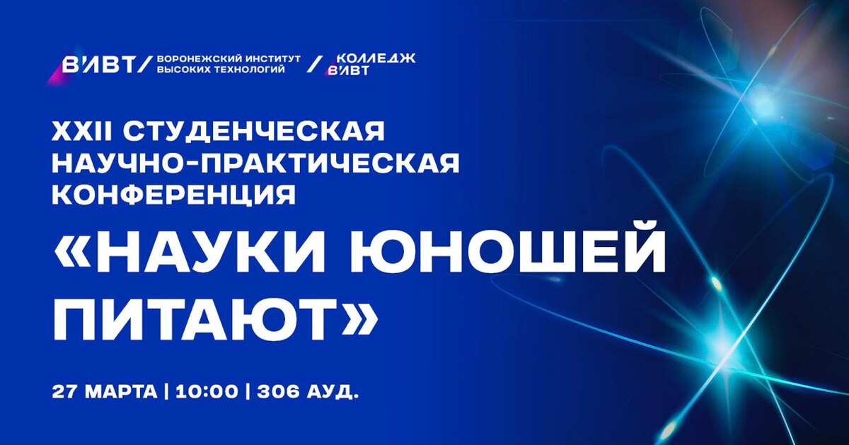 » XXII студенческая научно-практическая конференция «Науки юношей питают» состоится 27 марта в 10-00 в 306 аудитории. По традиции лауреаты конференции получат денежные призы, а все участники – грамоты. Заявки на участие и статьи для публикации принимаются до 25 марта на почту: spo@vivt.ru. Форму заявки можно запросить по этой же электронной почте или в 700 кабинете у О. В. Курочкиной. Подробнее по телефону: 8(473) 20-204-20 (добавочный 7003).
