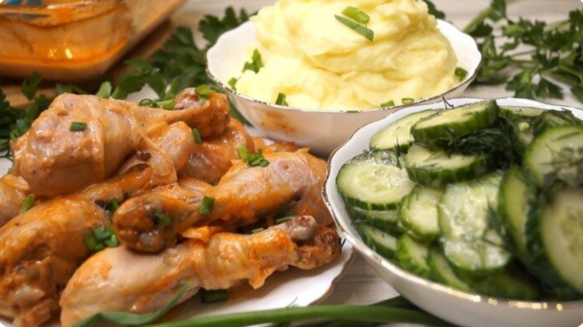 - Ужин: Курица, запеченная в духовке с картошкой. Оставшуюся половину курицы (после бульона) натираем солью, перцем, чесноком. Картошку режем дольками. Всё на противень и в духовку на 40–50 минут.