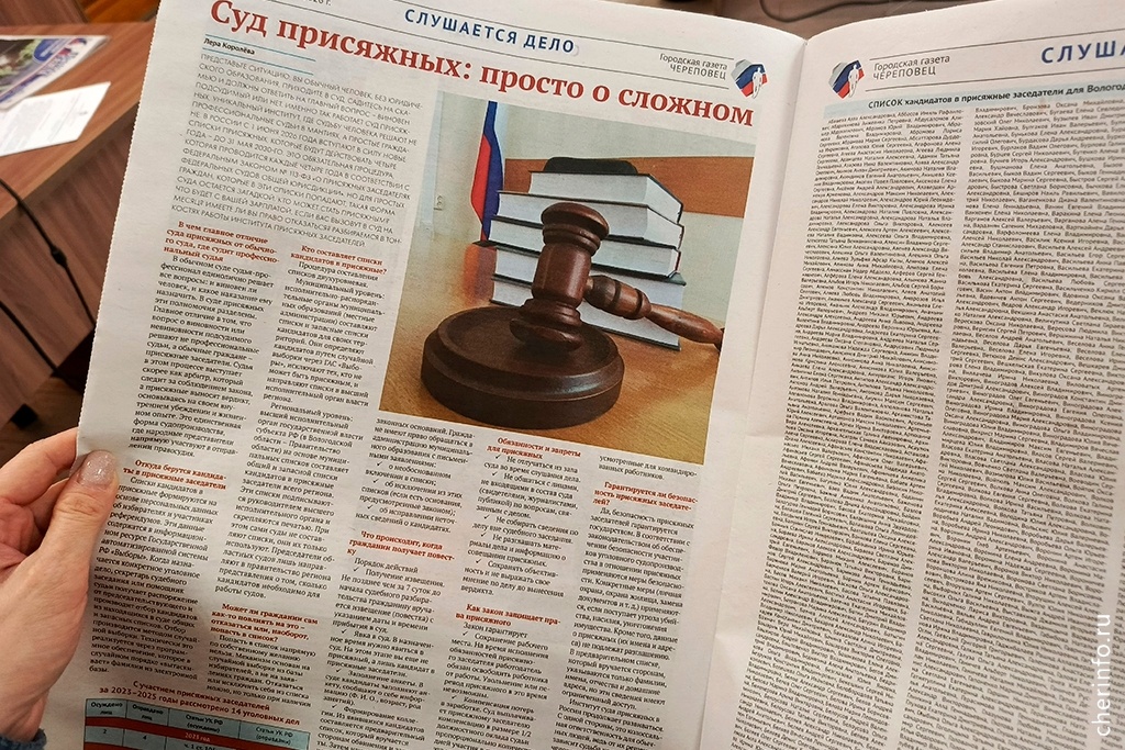 Списки кандидатов напечатаны в "Городской газете". "Они формируются на основе персональных данных об избирателях и участниках референдумов. Эти данные содержатся в информационном ресурсе государственной автоматизированной системы "Выборы". Когда назначается конкретное уголовное дело, секретарь судебного заседания отбирает кандидатов из находящихся в суде общих и запасных списков. Отбор производится методом случайной выборки. Технически это реализуется через программное обеспечение, которое в случайном порядке "вытаскивает" фамилии из электронной базы", - пояснили в суде. В Вологодской области с 2023 по 2025 годы рассмотрено 14 уголовных дел с участием присяжных. Восемь человек осудили, шестерых оправдали. "Городская газета" распространяется бесплатно во всех районах города. Источник: https://cherinfo.ru/news/145262-v-cerepovce-opublikovali-spiski-vozmoznyh-prisaznyh