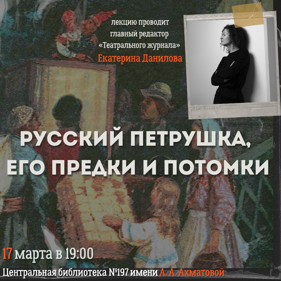 ? 👆👆👆 Об этом пойдёт речь на лекции «Русский Петрушка, его предки и потомки», которая пройдёт 17 марта в 19:00 в Центральной библиотеке №197 имени А. А. Ахматовой. Петрушка — один из самых узнаваемых персонажей русского народного театра. Этот длинноносый забияка пришёл из балаганных кукольных представлений. В культурной традиции герои подобного типа называются трикстерами. Они не сильные и не слабые, не свои и не чужие, не умные и не глупые, одновременно нарушители правил и жертвы своих же нарушений. К этому типу в той или иной степени относятся Одиссей, Карлсон, который живёт на крыше, Ходжа Насреддин и Остап Бендер. В европейской театральной культуре у Петрушки немало «родственников»: среди них Пульчинелла из итальянской комедии дель арте, английский Панч и немецкий Касперль. Все они — хвастуны, драчуны и насмешники, которые пренебрегают условностями, но умеют рассмешить публику лучше кого бы то ни было. 💙Как Петрушка связан с Фаустом? 💗Почему он орёт так, что невозможно пон