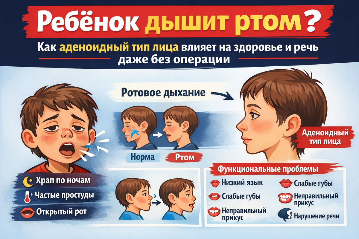 Это сигнал о том, что у ребёнка могло быть нарушено носовое дыхание, что влияет на рост лица и прикус.