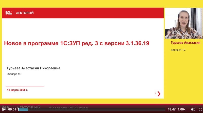 3 (версии 3.1.36.19 - 3.1.36.75) В ходе лекции Анастасия Гурьева, эксперт 1С, расскажет о новых возможностях программы «1С:Зарплата и управление персоналом 8», ред. 3, реализованных начиная с версий 3.1.34.145 и 3.1.36.19: 00:01:20 Версии 3.1.34.145 и 3.1.36.19 00:01:25 Выписка из приказа о бронировании 00:02:01 Законодательные значения 00:02:19 Классификатор ОКПДТР для форм статистики 00:03:00 Версия 3.1.36.19 00:03:05 Исправление и сторнирование документов 00:03:34 Бухучет начислений сотрудников 00:03:58 Настройки бухучета 00:04:28 Результаты аттестации сотрудников 00:04:42 1С:Плюс 00:05:08 Версии 3.1.34.172 и 3.1.36.39 00:05:14 Выделение долей РК и СН из оплат по среднему 00:05:57 Гражданин страны участника Договора о ЕАЭС 00:06:43 Тарифы страховых взносов 00:06:58 Исчисление страховых взносов с выплат в пользу руководителей 00:09:09 Раздел Помощь 00:09:35 Законодательные значения 00:09:44 Версия 3.1.36.39 00:09:48 Подробный ввод времени праздничных и выходных 00:10:27 Блокировка