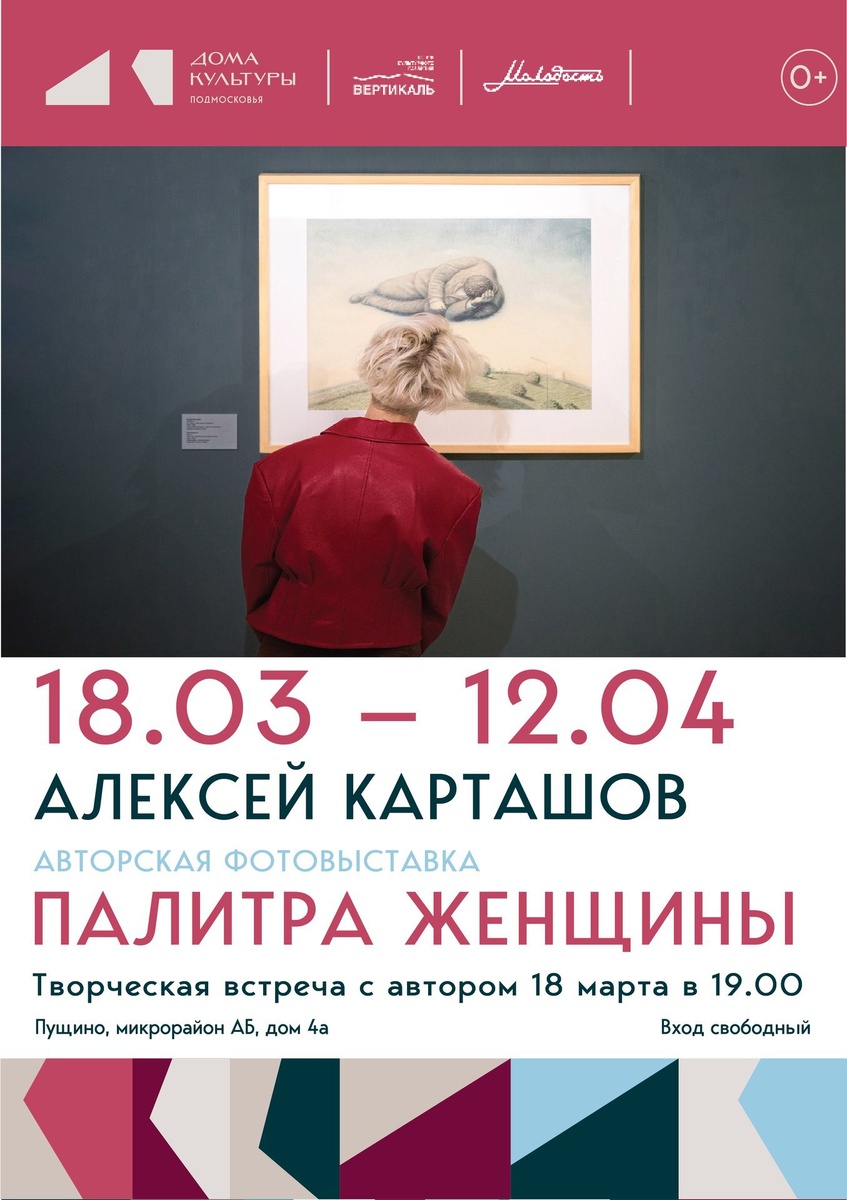 ✨ Фотовыставка Алексея Карташова «Палитра женщины» 📸«Палитра женщины» — персональная выставка работ фотографа-любителя Алексея Карташова. Идея выставки — объединить работы репортажной, студийной, жанровой и уличной фотографии, каждая из которых по-своему раскрывает, а в целом объединяет прекрасный и многогранный образ женщины во времени и жизненных обстоятельствах. 🚫 Возраст: 0+ 📆 18.03.2026 🕒 19:00 🏢 Кинотеатр Молодость г. Пущино 📍 г.о. Серпухов, г. Пущино, микрорайон АБ, 4А 💰 Вход свободный❗️ ⭐Поддержать канал голосом 💰 Канал Вакансии Серпухова ✅ Мероприятия Серпухов https://dzen.ru/id/66f01c6eb4c6fe60c9ca1608 https://vk.ru/serpukhov_events http://dzen.ru/serpukhov_events