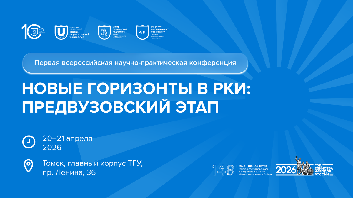 20-21 апреля 2026 года Центр довузовской подготовки Томского государственного университета проводит I Всероссийскую научно-практическую конференцию, посвященную десятилетию центра. Тема — предвузовский этап обучения иностранных студентов. Это встреча для тех, кто работает с иностранцами с самого первого дня их пребывания в России: помогает выучить язык, адаптироваться к новой среде и подготовиться к поступлению в вуз. Конференция — про живой опыт, новые идеи и практические инструменты. В программе: Можно выступить с докладом и опубликовать материал в сборнике (РИНЦ), либо просто поделиться опытом без публикации. Регламент — 7-10 минут, рабочее обсуждение не в счет. Оргвзнос для публикации — 1000 рублей. Сертификаты получат все участники. Зарегистрироваться до 5 апреля на сайте конференции Если планируете публикацию — отправить тезисы до 19 апреля на почту konf_precourse_tsu@mail.ru (тема письма: КОНФЕРЕНЦИЯ ЦДП, ПУБЛИКАЦИЯ). Оплатить взнос до 30 апреля. Тезисы принимаем объемом до 2000