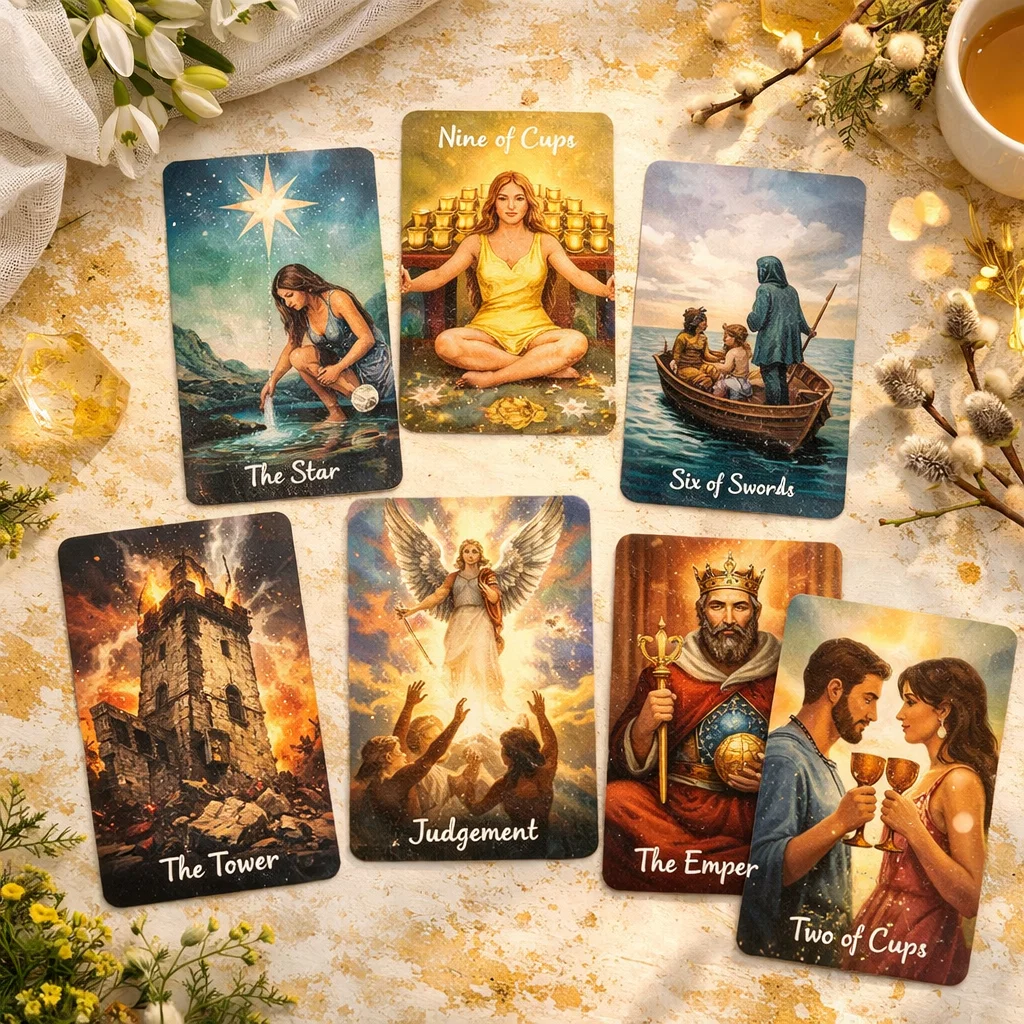 Первое, что очень ясно читается по этому раскладу: вы уже прошли важный этап внутренней трансформации. Звезда в начале расклада — карта людей, которые пережили эмоциональное потрясение, но сумели из него выйти. Это не всегда заметно со стороны. Снаружи человек может выглядеть спокойным, даже слегка отстранённым. Но внутри происходит серьёзная работа: пересмотр взглядов на отношения, на доверие, на собственную ценность.