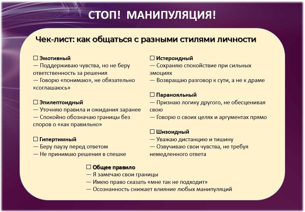 Ваши действия: Сочувствие важно, но не ценой себя. Можно поддержать словами и при этом сохранить границу: «Я понимаю, что тебе тяжело, и сейчас я не готов(а) это делать». Ваши действия: Помогает заранее проговаривать правила и договорённости. Если что-то не подходит – спокойно обозначать свою позицию, не вступая в борьбу за «правильность»: «Я не готов(а) продолжать разговор в таком тоне» «Я чувствую дискомфорт, когда ты это говоришь» «Я прошу уважать мои чувства», «Мне это не подходит» – универсальная фраза для отказа без лишних объяснений. Ваши действия: Берите паузу. Фраза «мне нужно время подумать» – здоровый способ не включаться в спешку. Темп другого не обязан становиться вашим. Ваши действия: Важно не реагировать только на эмоцию, а возвращаться к сути разговора. Спокойствие и чёткие формулировки помогают не втягиваться в драму. Ваши действия: Хорошо работают аргументы и логика, но не менее важно обозначать своё мнение как равнозначное. «Я вижу по-другому, и для меня это тоже важ