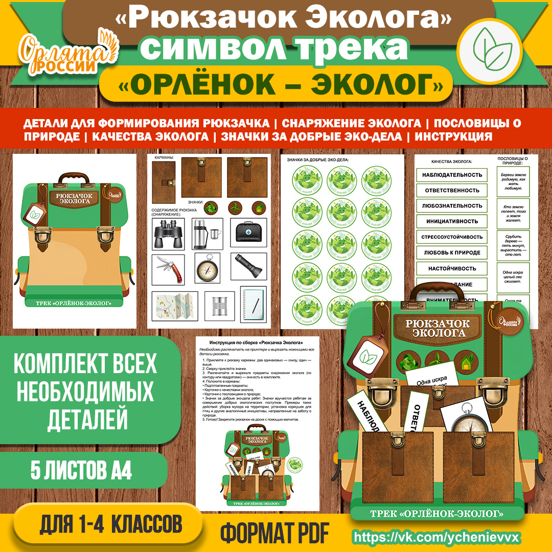 ДАННЫЙ комплект для создания "Рюкзачка эколога" можно скачать здесь. Хотите сделать занятия по треку «Орлёнок‑Эколог» (внеурочная деятельность «Орлята России») более интерактивными, наглядными и увлекательными? Представляю вашему вниманию «Рюкзачок эколога» — творческий элемент оформления, который поможет вовлечь детей в тему экологии, закрепить ключевые понятия и создать в классе особую атмосферу заботы о природе!