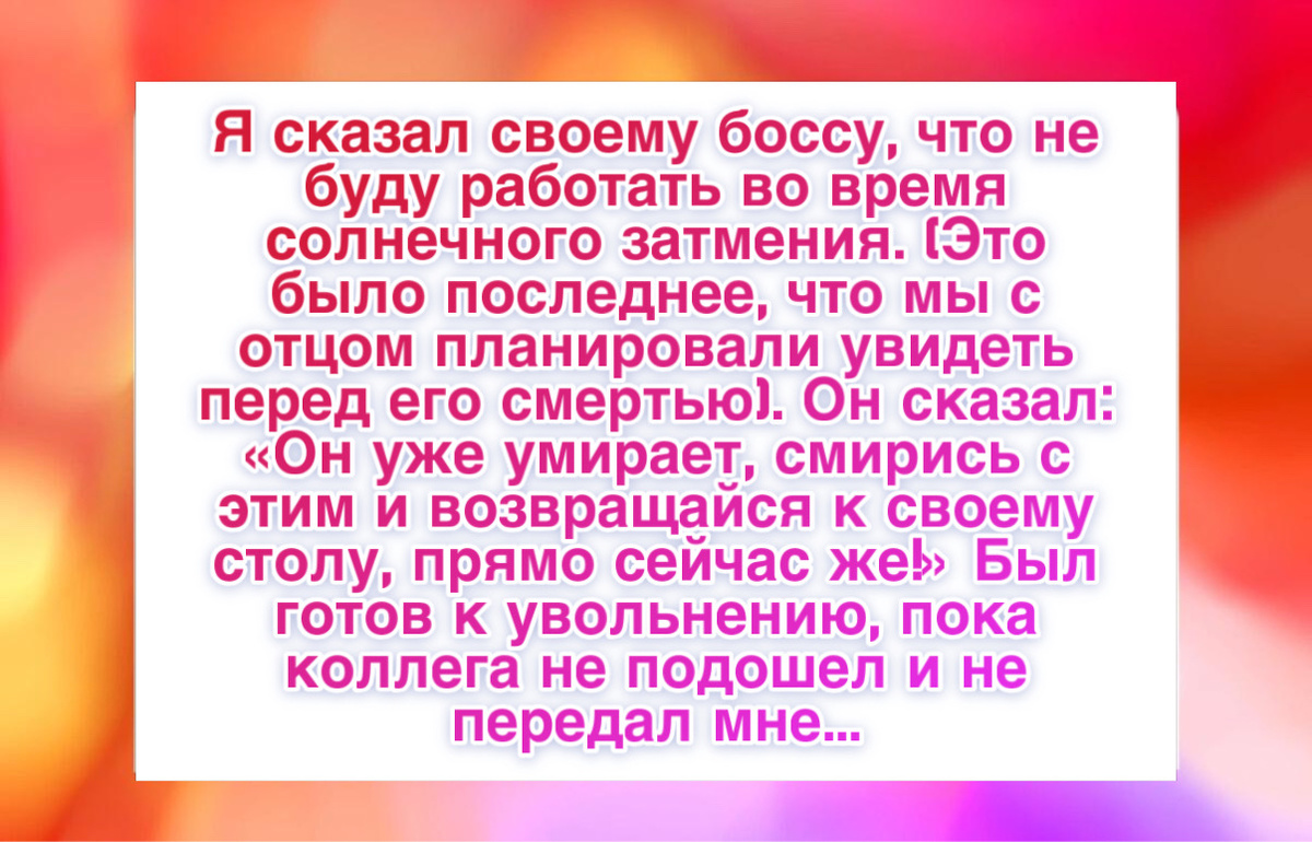 “Несколько месяцев назад я сказал начальнику, что в день солнечного затмения не смогу работать. Это было последнее событие, которое мы с отцом собирались увидеть вместе до его смерти.