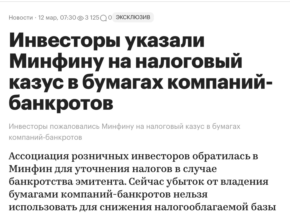 Сегодня основные деловые агентства опубликовали новость, что некие «инвесторы», то ли указали Минфину, то ли ему пожаловались на учет убытков: РБК: FrankMedia: Конечно для тех , кто попал на дефолтных облигациях, да потом еще их не продал , а сидел и ждал чуда до тех пор, пока их не сняли торгов (ну или дефолт произошёл при погашении), зачет убытка был бы хоть какой-то пилюлей. Но такой громкий пиар, который создали вокруг этой проблемы совсем не стоит этого. На несколько порядков для держателей облигаций важнее то, что при дефолте их инвестиции превращаются в ноль. То есть в России , абсолютно отсутствуют система: Обычно в России рейтинги снижают тогда, когда эмитент перешел в фазу распада и что-то там санировать поздно, так как все деньги уже давно вывели. Да, создание такой системы задача не простая, но именно она позволит создать прозрачный рынок публичного долга в России и убережет покупателей облигаций от полной потери своих средств. У нас же решили «приложить мертвому припар