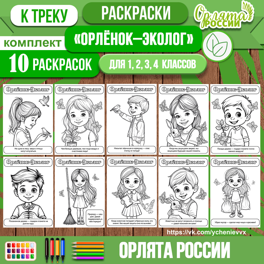 Я подготовила интересный и полезный материал для занятий по программе «Орлята России». Представляю вашему вниманию комплект из 10 раскрасок к треку «Орлёнок‑Эколог» — идеальный инструмент, чтобы увлечь детей темой заботы о природе через творчество! ДАННЫЙ комплект раскрасок к треку "Орлёнок-Эколог" можно скачать здесь (файл PDF).
