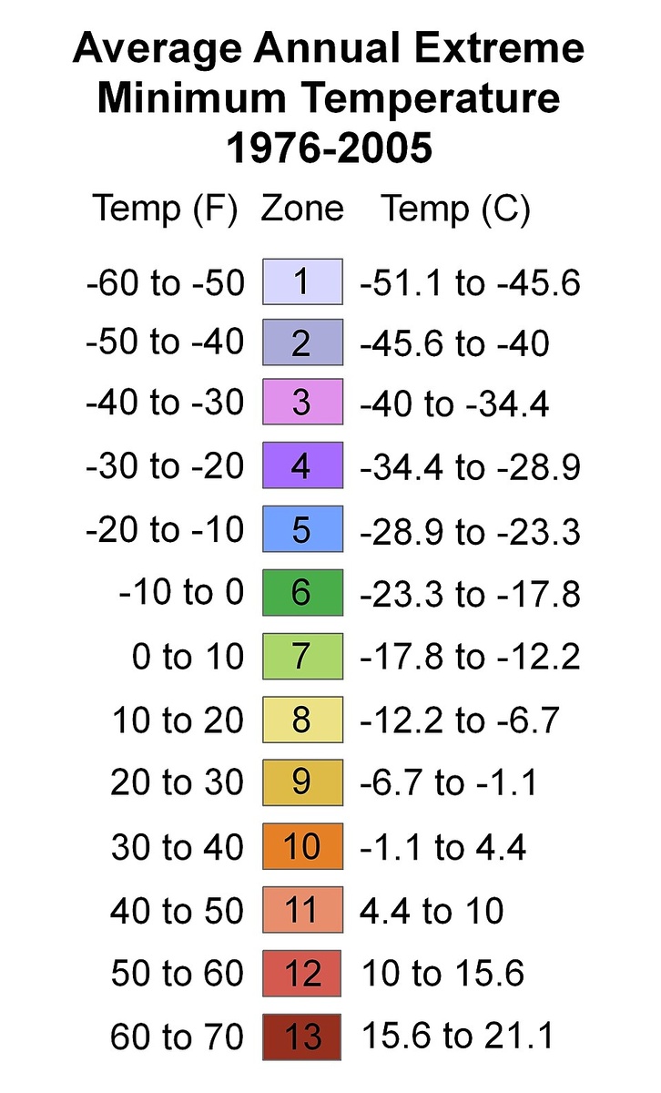 список населенных пунктов (в основном городов) России и СНГ с указанием их зон зимостойкости USDA (United States Department of Agriculture), основанный на предоставленных вами данных. Список отсортирован по зонам USDA (от самой холодной к самой теплой) для удобства анализа, а затем внутри зоны — по алфавиту. Зона 1 (экстремально холодная, ниже -45.6°C) Зона 2 (от -45.5°C до -40.1°C) Зона 3 (от -40.0°C до -34.5°C) Зона 4 (от -34.4°C до -28.9°C) Зона 5 (от -28.8°C до -23.4°C) Зона 6 (от -23.3°C до -17.8°C) Зона 7 (от -17.7°C до -12.3°C) Зона 8 (от -12.2°C до -6.7°C) Зона 9 (от -6.6°C до -1.1°C) Зоны USDA (или зоны зимостойкости) помогают садоводам и агрономам понять, какие многолетние растения способны выжить в условиях конкретной местности. Чем выше номер зоны, тем мягче климат (теплее зима). Разница между зонами основана на средней минимальной годовой температуре.