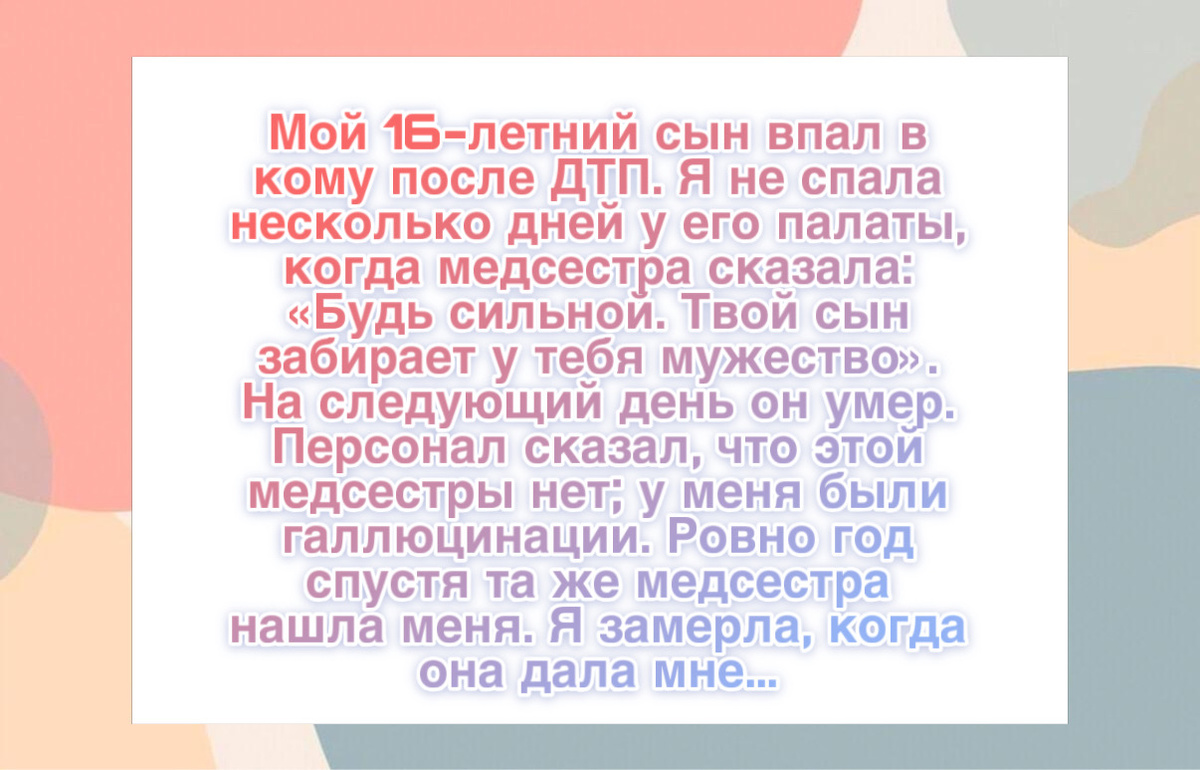 На следующий день мой сын умер. Когда я спросила про ту медсестру, мне сказали, что такой женщины в отделении нет. Врачи решили, что я просто была на грани и мне это привиделось.