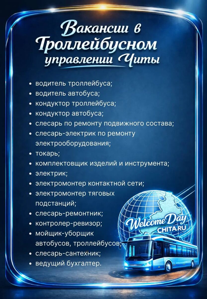 Уже 14 марта в 12:00 в «Мегаполисе» на Богомягкова, 23а, пройдёт Welcome Day @chitaru75. В этом году партнёрами стали Быстринский ГОК, «Нордголд» и ГРК «Западная». Набирать сотрудников будет и Троллейбусное управление Читы. Можно бесплатно выучиться на водителя троллейбуса или переучиться с категории «С» на «Д» для автобуса — при этом платят стипендию. На ярмарке вакансий можно пройти быстрое собеседование, узнать условия работы и задать все вопросы и найти работу с зарплатой от 100 тысяч рублей. Кроме этого будут и полезные выступления экспертов. ➡️ Нужна обязательная регистрация.