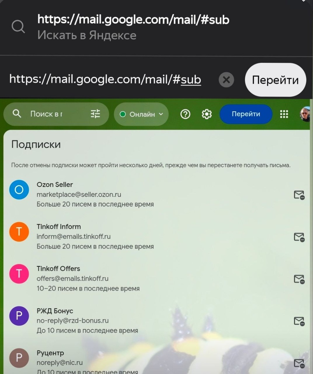 Я пользуюсь этой почтой ещё с древних времён — когда регистрация была закрыта и можно было попасть только по приглашению. Тогда я как раз получил инвайт и зарегистрировался. С тех пор почта постепенно превратилась в огромную свалку рассылок. Каждый раз открывать письмо и искать кнопку «отписаться» было лень, поэтому я просто забил. Но недавно нашёл удобный способ почистить всё сразу. Что нужно сделать: Открываем Gmail в браузере. - Если с телефона — включаем десктопную версию сайта. - В строке стираем часть и пишем #sub (в скриншоте видно.) - Gmail покажет все письма-рассылки, на которые вы подписаны. Справа у многих писем появится кнопка «Отписаться», и можно быстро пройтись по списку прямо из одного окна. В итоге за пару минут можно почистить почту от десятков старых подписок Очень простой, но почему-то мало кто об этом знает.