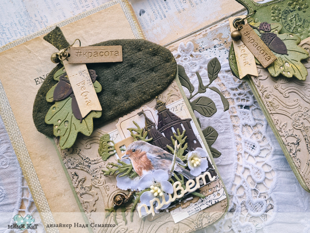 Я с трепетом ждала выхода нового релиза, чтобы воплотить свои идеи из наших новинок. Маленькая фигурка в форме герба из набора «Конь мой конь» сразу же напомнила мне жёлудь. Я обожаю их собирать — они такие разные, уникальные и невероятно красивые! Они всю зиму ждут своего часа, чтобы вырасти в могучие дубы и стать частью великого лесного мира. Создать красивый фактурный фон основы открыточек мне помог набор "Век суетных маркиз" , а оборотную сторону шляпки украсило тиснение "Незабудки". В открытках я стремилась передать волшебное преображение, тот момент когда появляются первые зеленые ростки, расцветают деревья, город наполняется пением птиц и все пробуждается от долгой зимней спячки. Здесь поддержали идею наборы "Стены древнего Кремля" и "Пижма", надпись позаимствовала в наборе "Голубой огонёк", а подвес с листочком и желудем из набора "Над городом кружатся" и "Лесной чай" Каждый жёлудь — это символ перемен и надежды. Пусть этот Весенний день подарит вам вдохновение и веру в л