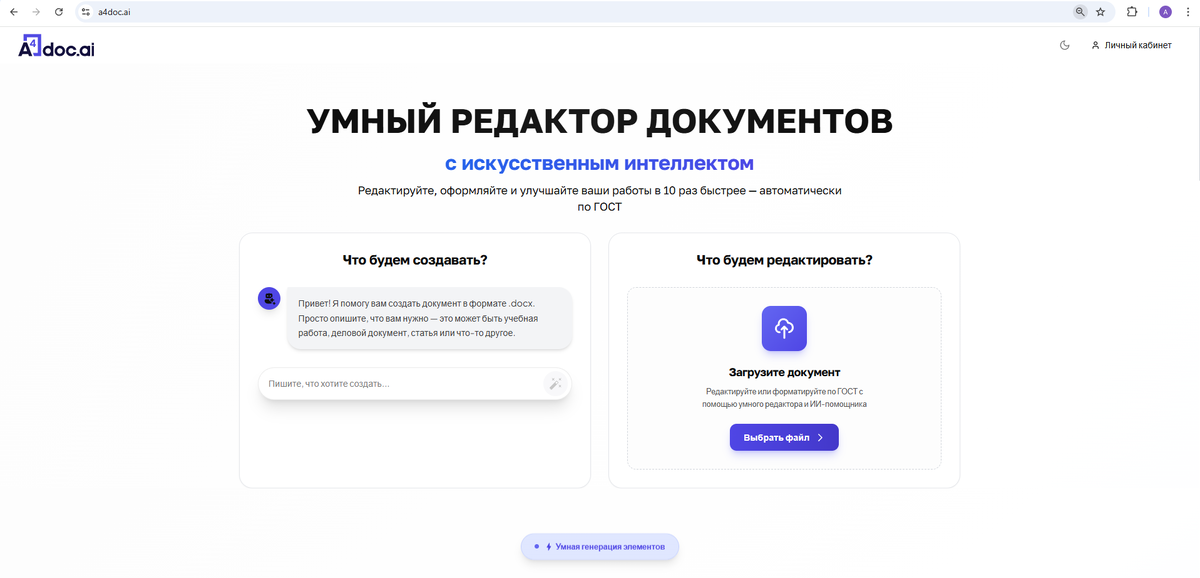 Это онлайн‑редактор документов с ИИ, который помогает создать текст, выстроить структуру и оформить всё по ГОСТ автоматически. В этой статье я по шагам покажу, как работаю над документом: от первого запроса до скачивания готового .docx.