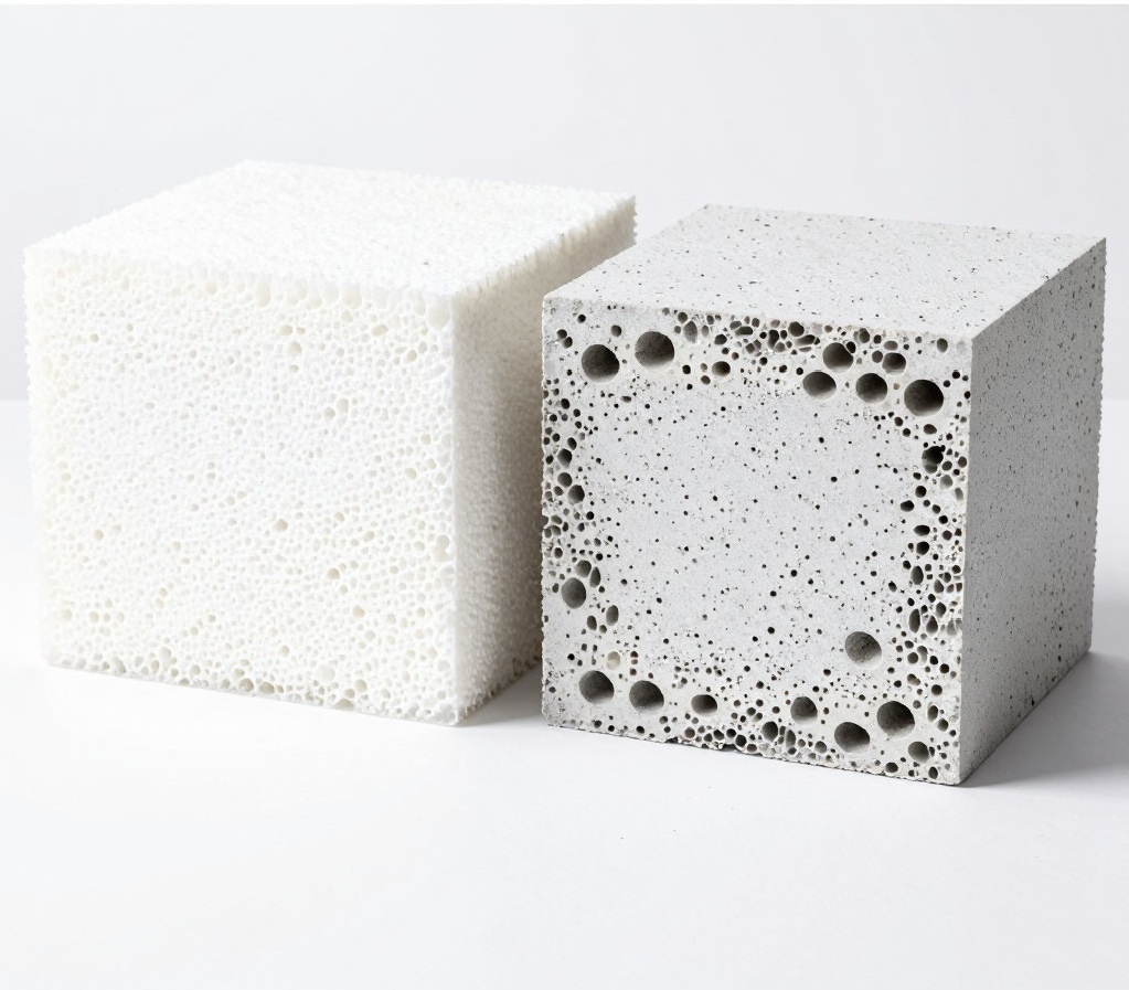 «Газобетон и пенобетон — это одно и то же», — слышу я довольно часто. Кто‑то даже считает эти слова синонимами. Но это совсем не так! Да, оба материала входят в группу силикатных блоков, но дальше начинаются сплошные различия. Сегодня, кратко разберу отличия газобетона от пенобетона - по ключевым параметрам. 1. Технология производства Газобетон: Поры образуются за счёт химической реакции: алюминиевый порошок реагирует с известью и цементом, выделяя водород (H2). Производится автоклавным методом: заготовки сушат в специальных камерах (автоклавах) под высоким давлением и температурой (около 190О C). Структура: мелкие поры (1–3 мм) равномерного размера и распределения. Пенобетон: Поры создаются механическим способом: в бетонную смесь добавляют пенообразователь, затем перемешивают. Сушка происходит естественным путём на открытом воздухе (неавтоклавный метод). Структура: крупные поры (до 5 мм), распределены хаотично. 2. Физические характеристики 3. Особенности монтажа Газобетон: Кладка на