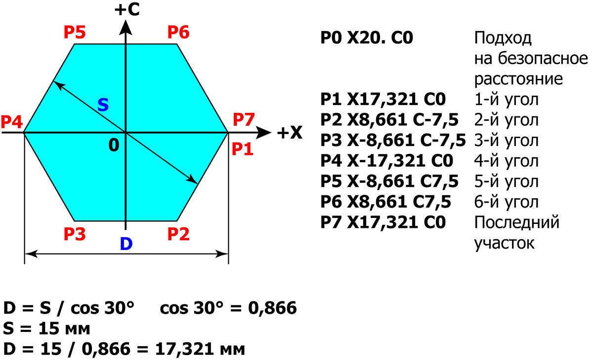 получим 17,321 мм. D = S / cos 30° = 15 / 0,866