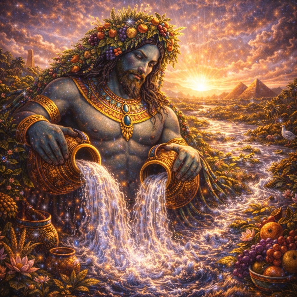 Хапи — это божество ежегодного разлива Нила, того самого великого события, которое определяло судьбу страны. Его нельзя путать с рекой как физическим потоком в современном понимании. Хапи — это не просто Нил как вода, а Нил как священный приход плодородия. Он воплощает не любую воду вообще, а именно благой, жизненный, насыщающий разлив, несущий чёрный ил, влагу, силу и будущий хлеб.