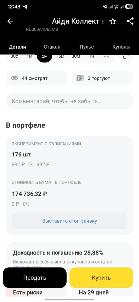 Купил еще на 174.000 облигации данной компании. Доходность к погашению за 29 дней составляет 28,88% годовых, если перевести в рубли, то получится порядка 3000р за 4 недели Можно сказать такой же подарок, как и спрошлыми облигациями, хотя не спорю, там я чуть лоханулся, но кто не совершает ошибок?