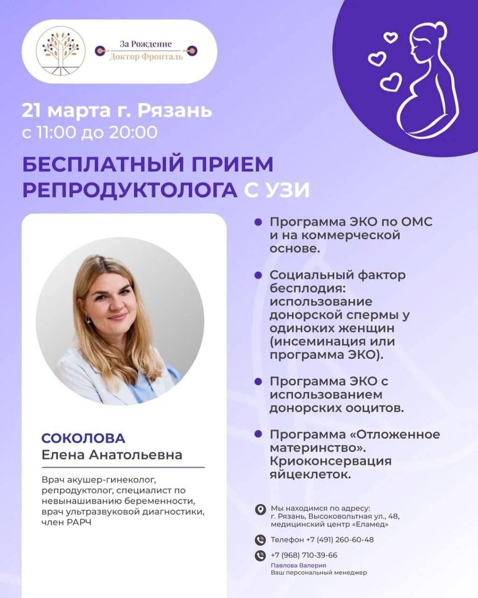 🗓️21 марта в г Рязань наш врач репродуктолог Соколова Елена Анатольевна проведет бесплатный прием.