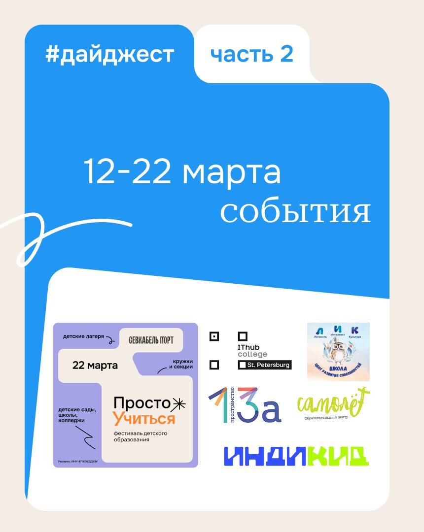 : • 18 марта День открытых дверей в средней ступени Самолёта Выборгский район vk.cc/cVkNxx • 18 марта День Открытых Дверей в Пространстве 13а Петроградка vk.cc/cVkNDj • 19 марта День открытых дверей в школе ИндиКид Крестовский остров vk.cc/cVkNJv • 21 марта День открытых дверей в Математической школе ЛИК пос.Парголово vk.cc/cVkNT3 • 22 марта Фестиваль детского образования Просто Учиться Севкабель Порт vk.cc/cBhzEv • 22 марта День открытых дверей колледжа IThub Петроградка vk.cc/cVkO2I Фестиваль | Мы ВК Сайт Просто Учиться Календарь событий Просто Учиться Мы на Яндекс.Дзен