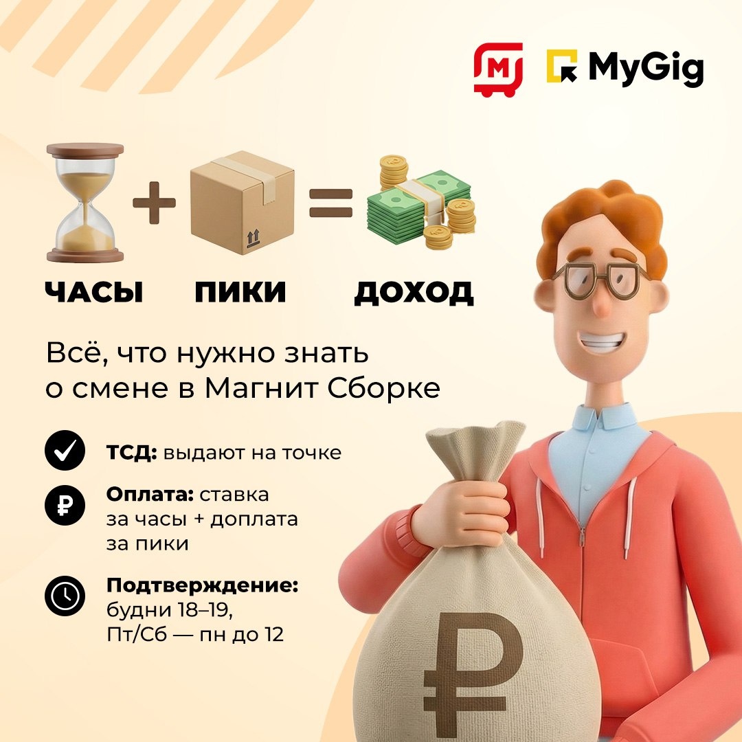 ! Как это работает: 🛑 Вы получаете ТСД (терминал сбора данных) на точке — ваш главный инструмент 🛑 Система показывает, что и где взять: собираете заказы для доставки быстро и без ошибок 🛑 Каждый собранный «пик» = доплата к гарантированной часовой ставке 🛑 Подтверждение часов — в приложении по отчёту из ТСД: прозрачно и честно 🛑 Изучите инструкцию работы с ТСД Ваши задачи: 🛑 Комплектовать и упаковывать заказы через ТСД 🛑 Контролировать качество и сроки годности 🛑 Связываться с покупателями при заменах и передавать заказы курьерам 🛑 Помогать в зале в свободное время Подтверждение часов в приложении: — Смены в будни: 18:00–19:00 на следующий день — Смены в Пт/Сб: понедельник до 12:00 Поддержка: — Чат в приложении MyGig или координатор, номер которого указан в карточке смены — Администрация на точке 👉 Попробуйте удобный формат подработки: открыть приложение Серия завершена! Предыдущие посты: — Магнит Сборка: выбирайте город и формат — Что нужно для старта? — Как проходит см
