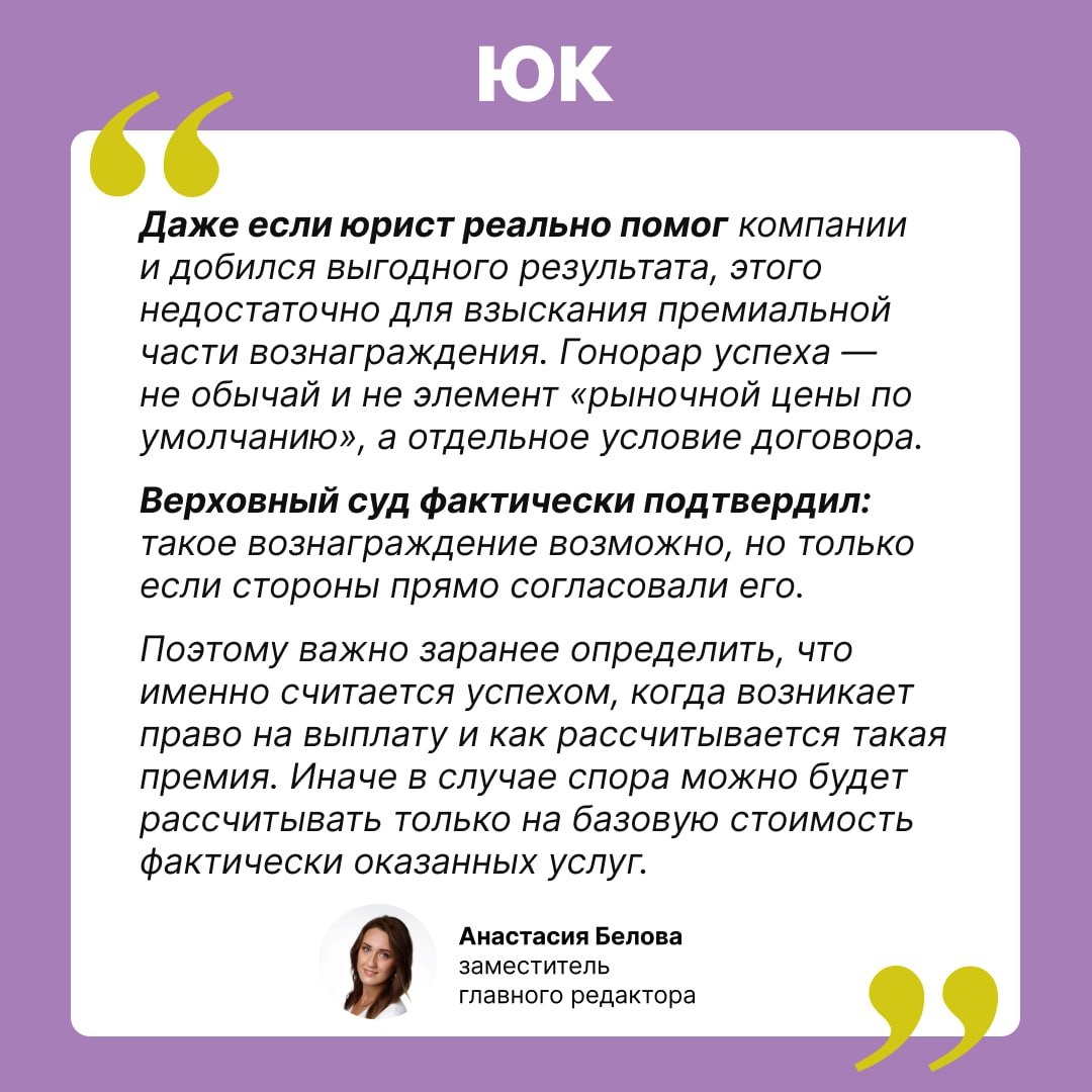 ➡️ Такой вывод сделал Верховный суд в споре о взыскании стоимости юридических услуг. Представитель компании действовал по доверенности, письменный договор стороны не подписали. После завершения спора представитель потребовал оплату как неосновательное обогащение. Суды трех инстанций взыскали с доверителя больше 15 млн руб. Они исходили из заключения экспертизы, которая включила в рыночную стоимость услуг не только обычное вознаграждение, но и гонорар успеха — 10 процентов от положительного для клиента финансового результата. ⚖️ Верховный суд исправил ошибку нижестоящих судов и направил дело на новое рассмотрение. ВС указал: отсутствие письменного договора само по себе не означает, что соглашения не было. Оно может подтверждаться поведением сторон, доверенностью и другими доказательствами. Но условие о гонораре успеха не может считаться подразумеваемым. Его нужно отдельно и ясно согласовать — в том числе определить, какой именно результат считается успехом и влечет выплату дополните
