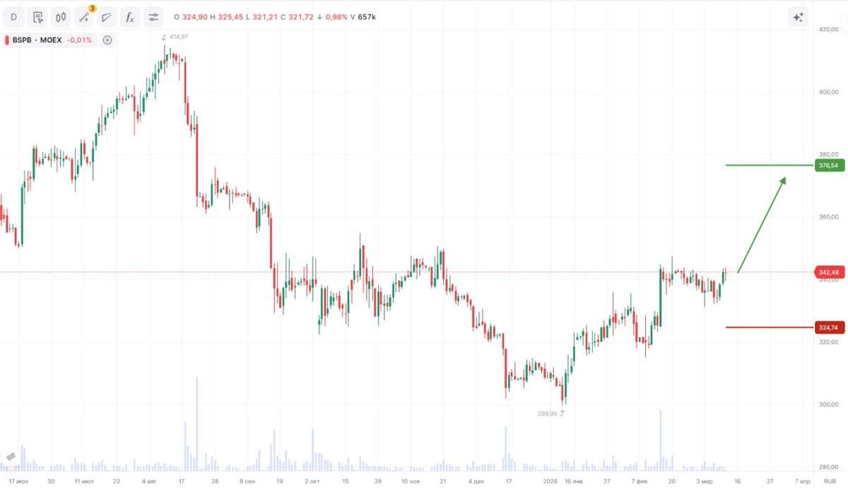 » Тикер: #BSPB Идея: Long ⬅️ Срок идеи: 1 месяц Цель: 376,00 руб. Потенциал идеи: 9,78% Объем входа: 6% Стоп-приказ: 323,90 руб. 🧳 Технический анализ Цена формирует разворотную формацию с ростом объемов на покупку, подтверждая инициативу покупателей. Закрепление выше сопротивления открывает потенциал для продолжения восходящего движения. При объеме позиции в 6% и выставлении стоп-заявки на уровне 323,90 руб., риск на портфель составит 0,33%. Соотношение прибыль/риск составляет 1,80. 🏦 Фундаментальный фактор #БСП — один из крупнейших региональных банков России, работающий с корпоративными и розничными клиентами. Устойчивая бизнес-модель обеспечивает стабильную генерацию прибыли даже в условиях изменения процентных ставок. Действующая программа обратного выкупа акций и дивидендные выплаты поддерживают интерес инвесторов к бумаге. 🤖 AI-скринер Проверьте инвестиционную идею по BSPB с помощью искусственного интеллекта 📊 Финам Торговые сигналы – это рыночные сигналы, идеи, торговые п