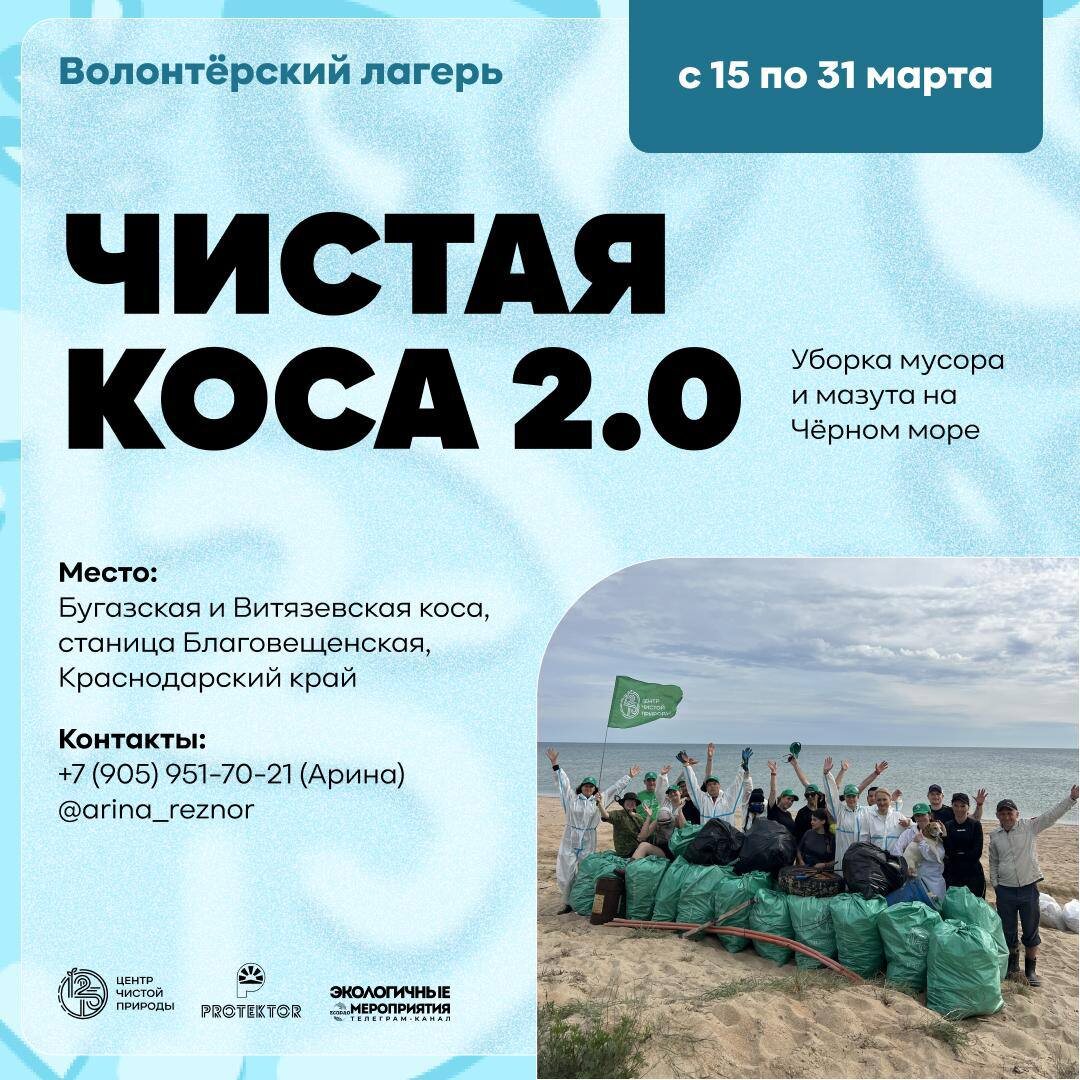 Витязевскую косы от штормового и замазученного мусора. Что вас ждет: • очистка побережья • бесплатное проживание и питание • компенсация проезда до 5000 ₽ для первых 6 участников • дружеская атмосфера и фото-/видеоотчет Даты: с 15 по 31 марта Место: станица Благовещенская, Анапский район Условия: 18+ и готовность к ежедневному труду Мест мало! Подробности и регистрация по ссылке 🔗 Экосфера