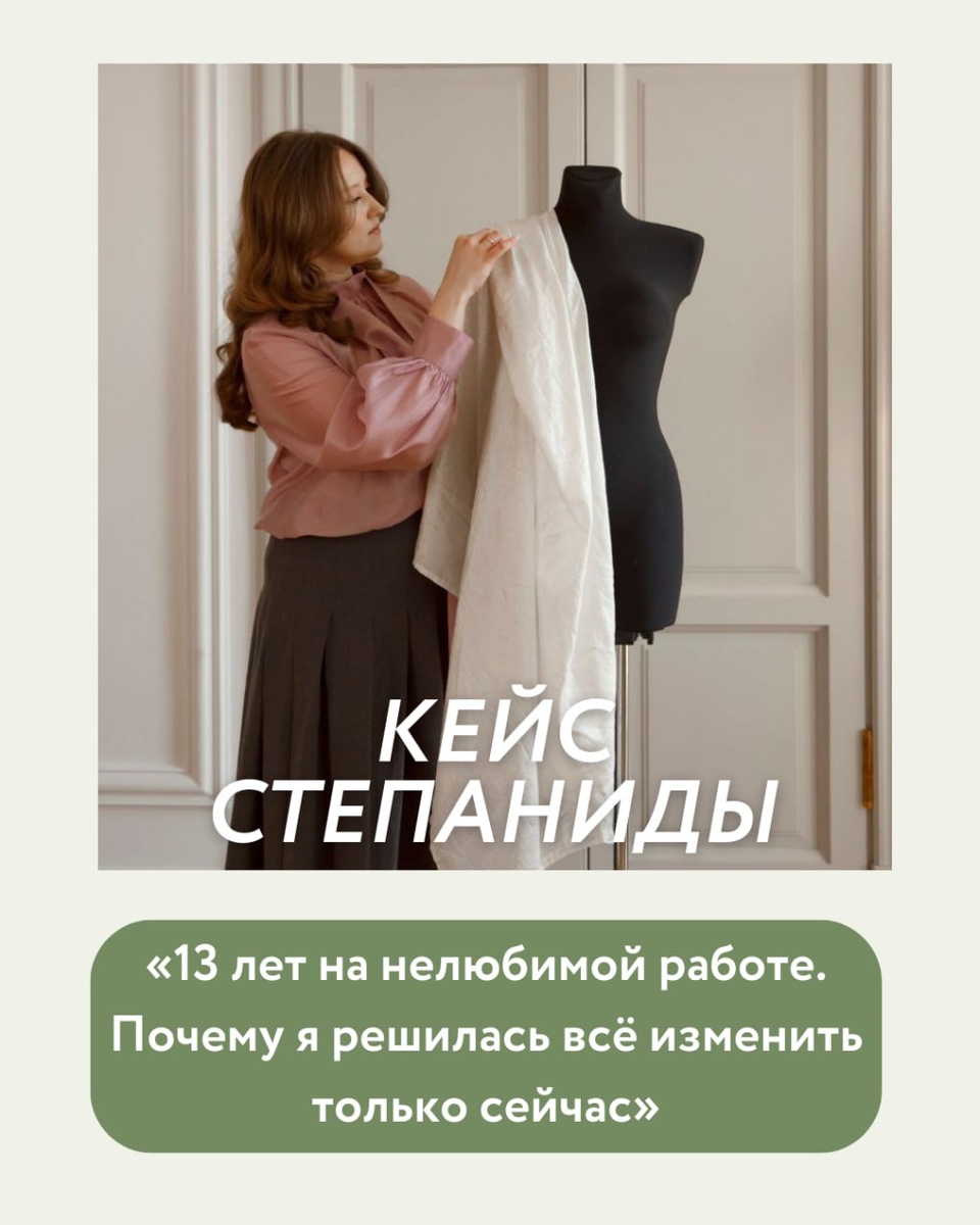 !» Иногда мы можем быть очень близко к той сфере, которая нам подходит и станет 100% попаданием в наше «хочу», но все равно никак не можем её найти. Чаще мешают страхи, установки, растерянность в пути. И если очередная попытка «попробовать что-то ещё» не помогает, то нужно найти свой фундамент: призвание, ценности и смыслы. 🎤Сегодня публикую кейс Степаниды в виде небольшого интервью о том, как сложился её путь после нашей работы над поиском её призвания и ценностей. 💚💚💚💚💚 💚 💬Расскажите про свой опыт работы до консультации Я всегда знала, что мне интересны одежда, творчество, дизайн. Но получилось так, что сначала я поступила на ювелира. Это тоже творчество: делаешь что-то руками, видишь результат, но это оказалось совершенно не моё. После я поступила на высшее образование в Академию художеств на искусствоведа. Это оказалось ещё дальше от того, чем я действительно хотела заниматься. Я устроилась в музей и проработала там 13 лет. 💬Почему вы приняли решение прийти ко мне?