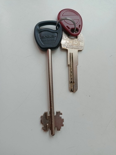 Ключ от сувальдного гардиана говорит о том что дверь довольно толстая. Можно предположить что это дверь в частном доме, но вот чип на связке все же говорит о том что это квартира. Хотя чип может быть и от калитки.
