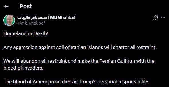 Мохаммад Багер-Галибаф "Мы откажемся от всякого сдерживания и заставим Персидский залив пропитаться кровью захватчиков. Кровь американских солдат - личная ответственность Трампа", - написал он в социальной сети X. 🔴 Читайте Sputnik Беларусь в MAX