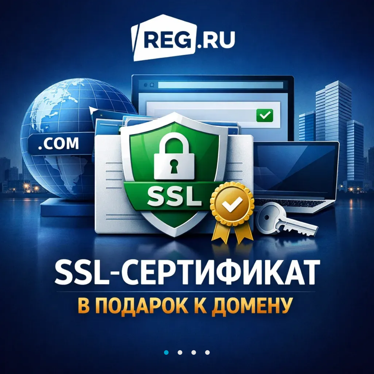 При регистрации нового домена в зонах .RU, .SU, .РФ или .COM на сайте Рег.ру вы можете получить в подарок SSL-сертификат уровня Domain Validation (DV) на 6 месяцев. Чтобы воспользоваться предложением: 1. Авторизуйтесь на сайте Рег.ру. 2. Перейдите в раздел «Домены». 3. Подберите подходящее доменное имя в зонах .RU, .SU, .РФ или .COM и нажмите «Подобрать» → «Перейти к заказу». 4. Отметьте подключение бесплатного SSL-сертификата. 5. Нажмите кнопку «Оплатить». https://businessbook.one/it-po-internet/reg-ru-ssl-sertifikat-v-podarok-k-domenu/