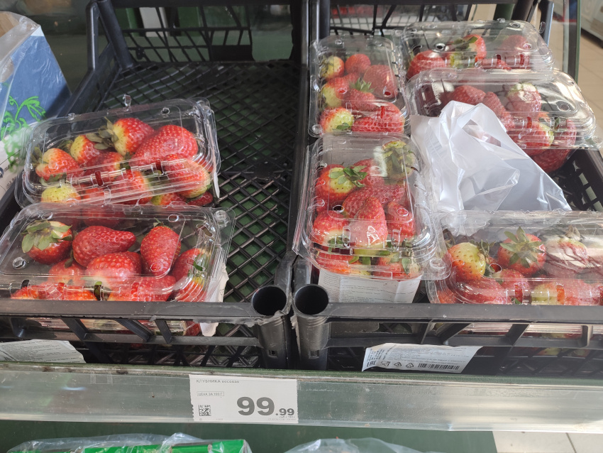 В сетевых магазинах Камышина на прилавки выложили свежую клубнику. Цена за 100 граммов - без одной копейки 100 рублей, значится на ценнике.