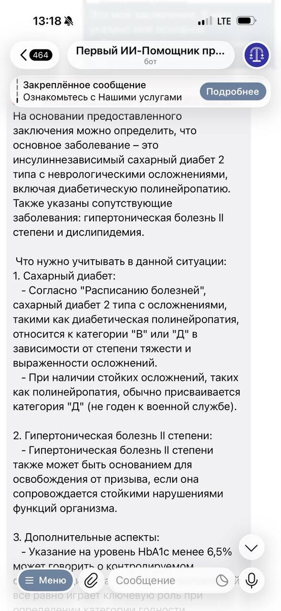 ✅ Для проверки отправил ему вопрос из чата с фотографией-сканом заключения. Посмотрите, как он разобрал ситуацию за 1 минуту ↑ Попробуйте сами: @A_P_help_bot